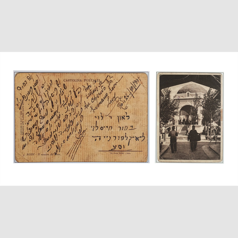 bA(I)bylon #4. 5 languages on one postcard sent from Rhodes to Los Angeles. Jewish Museum of Rhodes, Greece, .