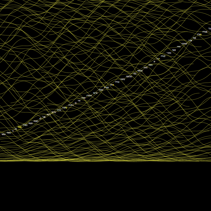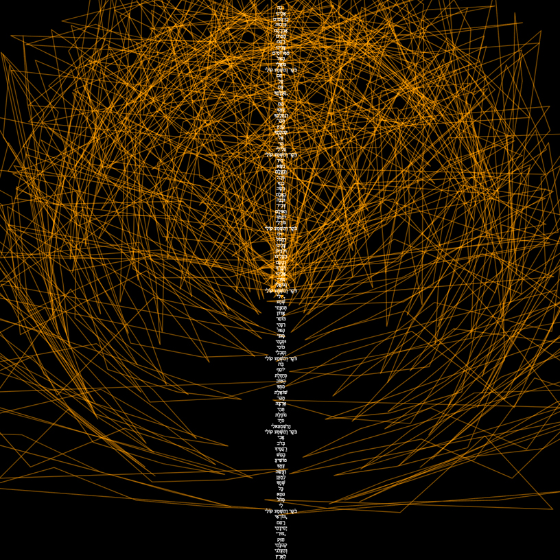 “Atsula Lefanim Coding“ (“True Nobility”) is based on the text of the famous poem by Rabbi Abraham ben Ezra. Abraham ben Ezra (1092, Tudela, Taifa of Zaragoza – 1167, Calahorra, Kingdom of Navarre) was a famous scientist, philosopher and rabbi who was one of the founders of Hebrew grammar. The first two verses of the hymn “Atsula Lefanim” praise the Torah, and the subsequent ones bless the “bridegroom of the Torah” – the reader who has the honor of reading its last section, completing the cycle of reading the Torah for this year. “Atsula Lefanim” by Abraham ben Ezra was recorded by Yemenite Jews in the prayer book "Tachalal". The song is performed at night on the holidays of Shavuot and Simchat Torah. "Atsula Lefanim" refers to the type of "Nashid" – one of the types of piyyut in the Yemenite Jewish tradition, built on the principles of classical Arabic kashida. Each verse of this hymn begins with a Hebrew letter forming an ACROSTIC – the word ABRAHAM. Yellow lines connect the letters ACROSTIC and “draw” a complex graphic system reminiscent desert landscape.