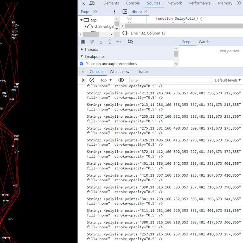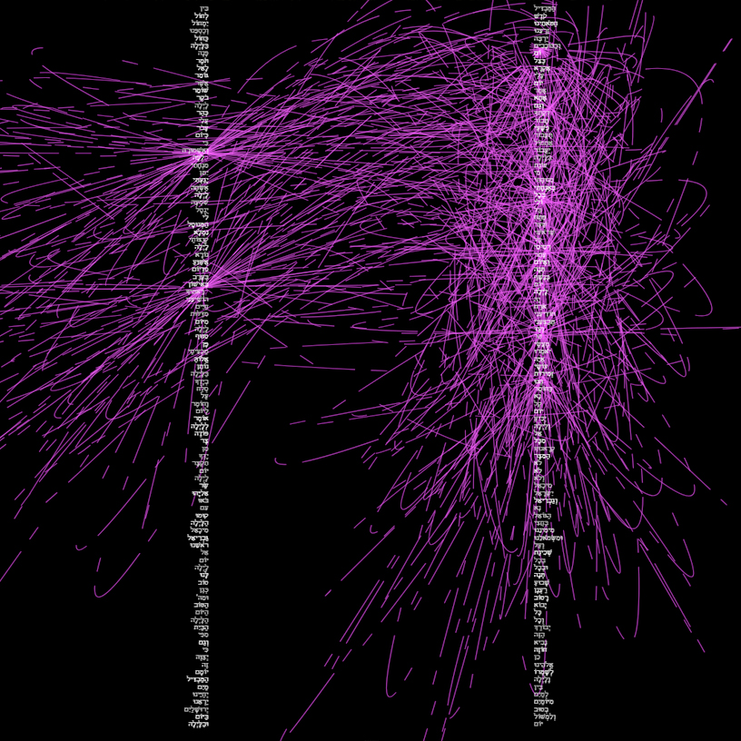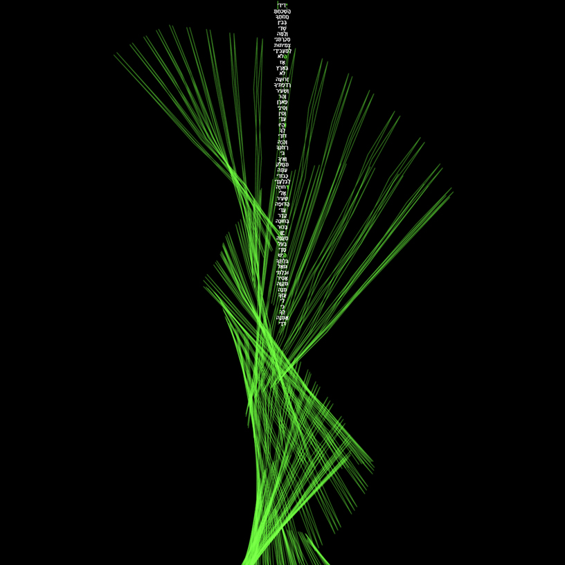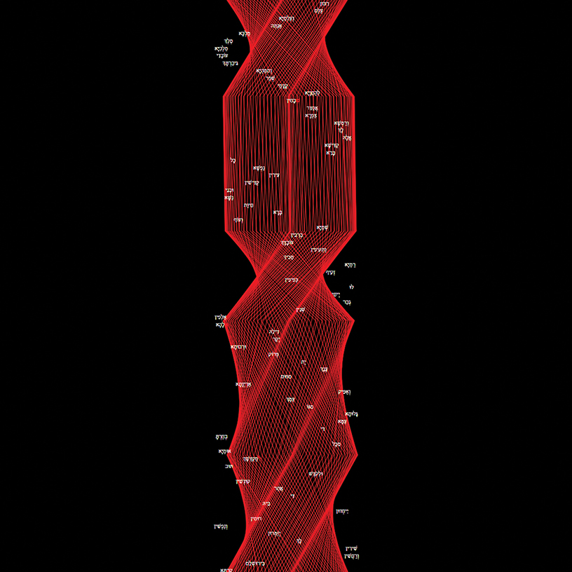 “Yah Ribon Coding” (“The Most High is the King of the World”) is based on the text of the famous Shabbat hymn of Rabbi Israel ben Moses Najara, glorifying the one Creator. Israel ben Moses Najara (c. 1555, Ottoman Empire – c. 1625, Gaza, Ottoman Empire) was a famous Jewish liturgical poet, preacher, biblical commentator, kabbalist, and subsequently rabbi of the city of Gaza. The book “Zemirot Yisrael“, originally called “Zemirot Yisrael Najara“, was first published in Safed (1587) and contained 108 piyyutim and hymns. “Yah Ribon” is a famous hymn included in this book of poems. Each verse of “Yah Ribon” begins with a Hebrew letter forming the acrostic word ISRAEL. The red strings in the video connect the letters of the ACROSTICS and “draw” a complex graphic system reminiscent of transparent crystals. The red color for the strings was chosen according to ancient Jewish tradition as a symbol of strength and heroism.