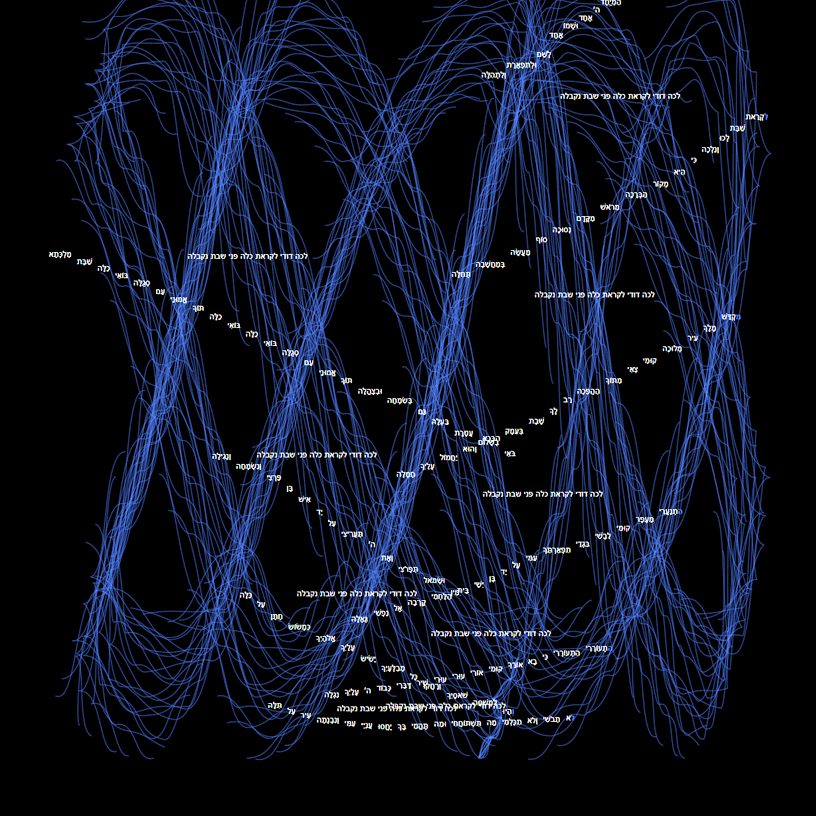 “Shifat Revivim Coding” (“Abundance of Rainfall”) is based on the text of Ibn Gabirol’s famous poem from the book “Tikkun HaGeshem”. Rabbi Shlomo Ben-Yehuda ibn Gabirol, also known as Ibn Gabirol, was a Spanish-Jewish philosopher and poet who lived in the 11th century (1021, Malaga, Spain – 1058). Tikkun HaGeshem (c. 1040) is one of his books of poetry. This collection of poems is part of Ibn Gabirol's wider oeuvre, which includes philosophical treatises, religious poetry and writings on ethics. “Tikkun HaGeshem“ is especially known for its spiritual and mystical themes, often exploring the relationship between humanity and the divine. In Ibn Gvirol's hymn “Shifat Revivim“, streams of rain are a symbol of salvation. Each verse of this hymn begins with a Hebrew letter forming an acrostic – the words SHLOMO CHAZAK (SOLOMON THE MIGHTY). The blue streams in the video connect the letters of the ACROSTICS and “draw” a complex graphic system reminiscent of falling rain.