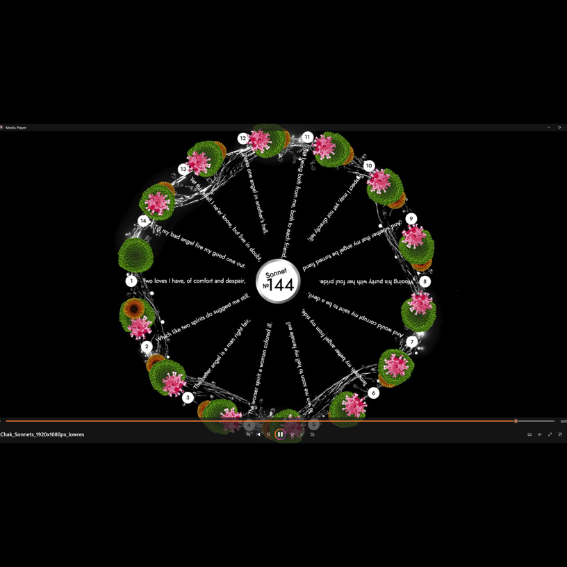 Using AI tools like ChatGPT 4.0, Gemini, and DeepAI, I “completed' the 14 missing sonnets to form a Sonnet Crown titled “Two Loves I Have of Comfort and Despair”, effectively becoming an inadvertent “co-author” with Shakespeare. Hundreds of verses were refined to match the rules and cadence of Shakespearean sonnetry. Using Suno AI, I generated a soundscape from biological signals—microbes and unicellular organisms producing textures, rhythms, and tonalities—which accompanies the sonnets, while ElevenLabs AI performs the reading of the texts. Using MidJourney, I created bacterial imagery, while Luna and Vivago programs helped me craft short video reels, ultimately integrating them into the project.